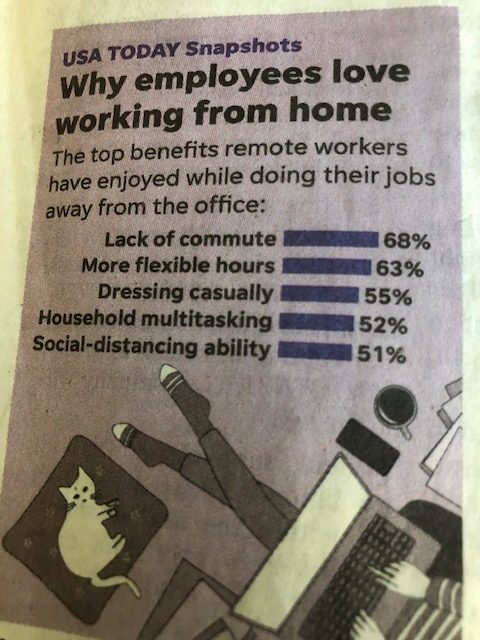 This has been an interesting time for workers who have had to stop their commutes and literally work from home. But has that been an advantage? According to this small graph apparently so. A whopping 68% preferred not making that commute every day. We all know that wardrobes have become much more casual and flexible hours are a plus.